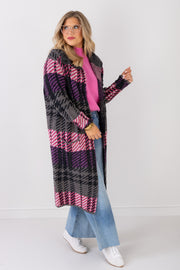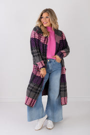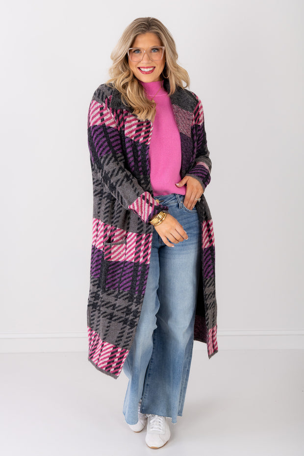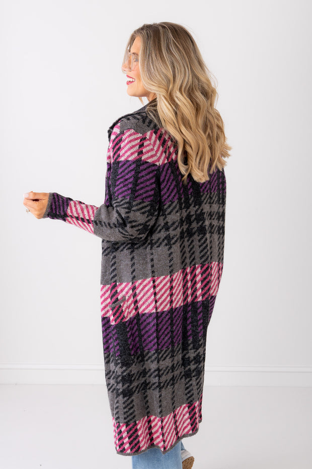 The Grey Toronto Plaid jacket features a grey plaid pattern with pink and purple accents on the front pocket. Crafted for softness and comfort, this long sleeve jacket adds a cozy, stylish touch to your wardrobe.