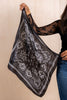 Elevate your style with this luxurious square bandana scarf, featuring an intricate overlay pattern in silky satin. Perfect for versatile styling—wear it as a headscarf, neck accessory, or bag embellishment for instant sophistication.