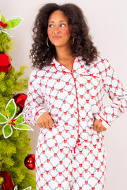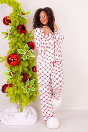 This Mary Square Pajama Set features a button-down, long-sleeve top with a collar and waist-length cut, paired with wide-leg bottoms and an elastic waistband for comfort.