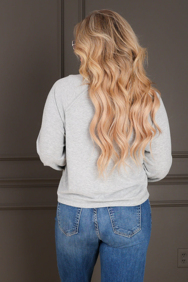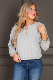 This heather grey long sleeve top features a button-down front, a round neckline, and a soft, buttery feel. It offers a comfortable and versatile option for everyday wear.