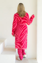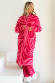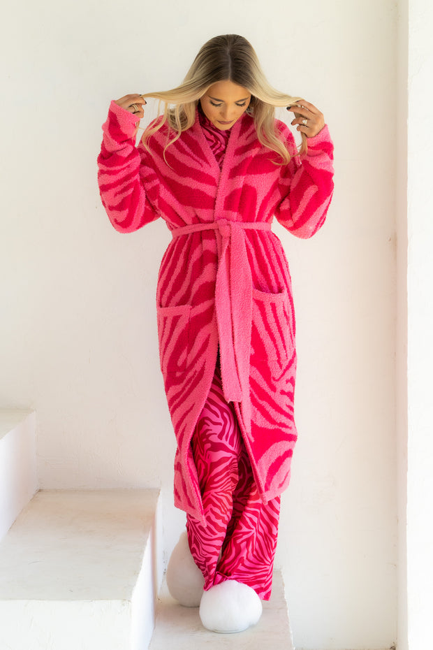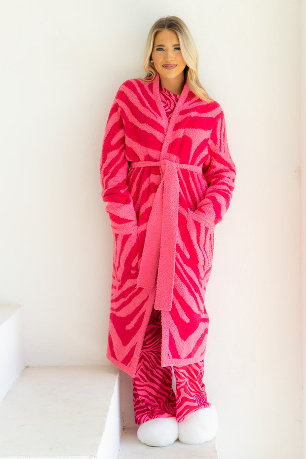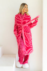 Make a statement in this bold zebra-print robe with long sleeves and extended hemline. The open front silhouette and cinched waist tie create a flattering, versatile look perfect for lounging or layering over your favorite outfits.