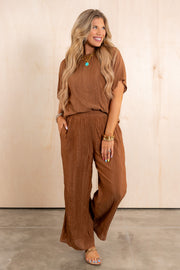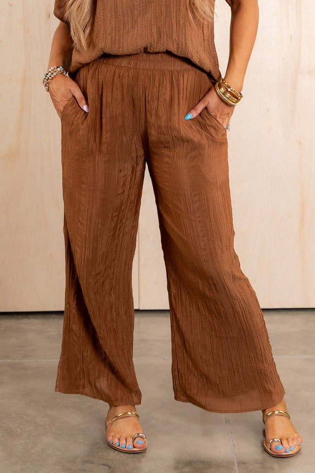 These Wide Leg Pant offers a comfortable elastic pull-on waistband and practical side pockets. Made from textured material, it combines style with a relaxed wide leg silhouette for easy movement and a modern look.