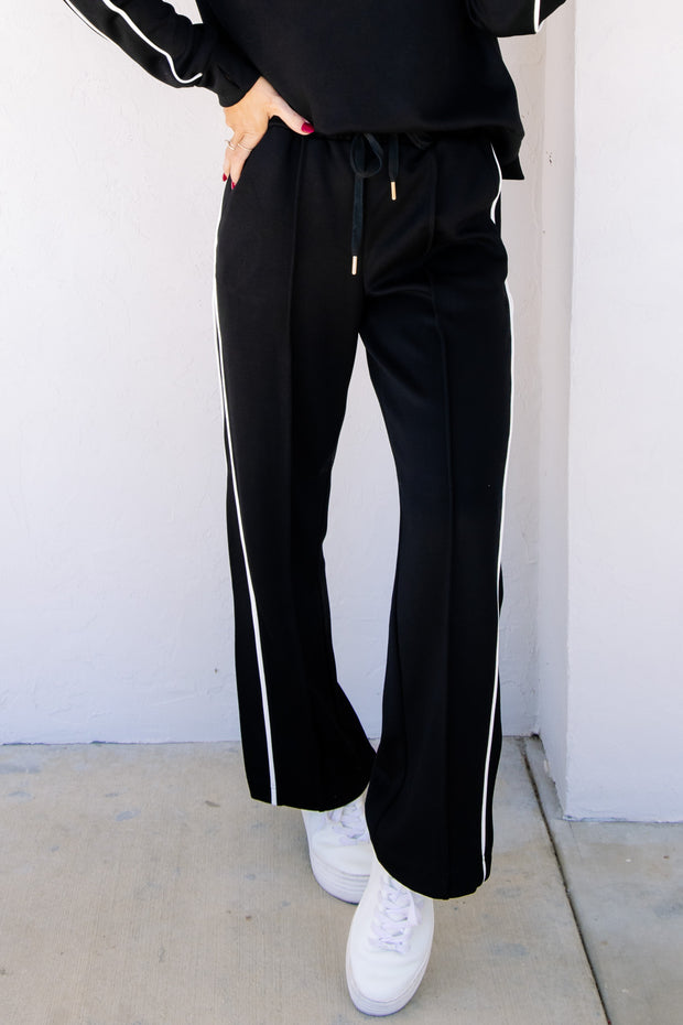These wide-leg pants feature an elastic waistband with a functional drawstring for comfort and fit. Stylish black piping along the sides adds a sleek finish to your casual or dressy looks.