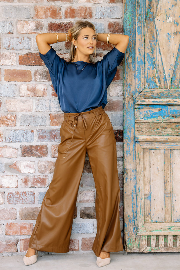 The On the Roof Chocolate Faux Leather Wide Leg Pant combines style and comfort with a soft faux leather finish. It features an elastic pull-on waistband with a tie, functional side pockets, and faux back pockets for a polished look.