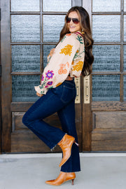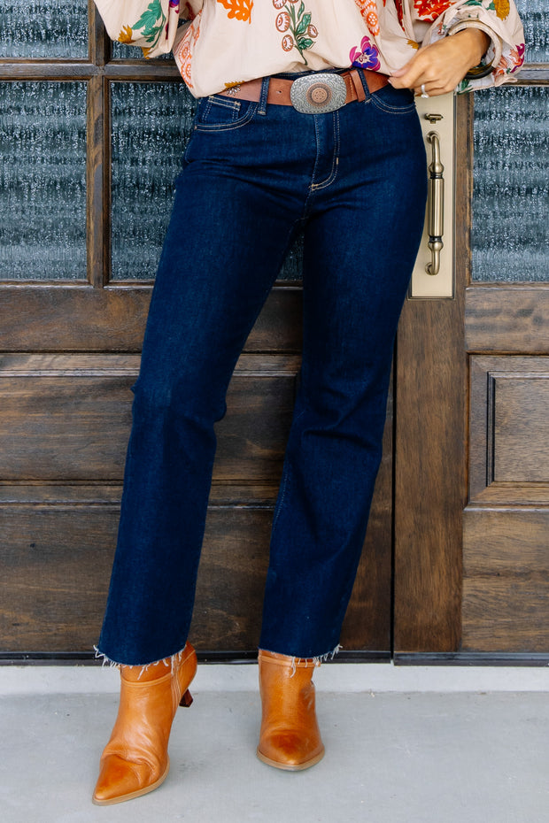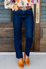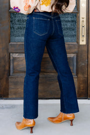 These Just Black Dark Denim Cropped Flare Jeans feature a high-rise fit with a front zip and button closure for easy wear. The dark wash and cropped flare silhouette create a stylish look, while side pockets add practical storage. Perfect for everyday wear with a modern touch.