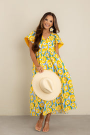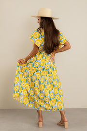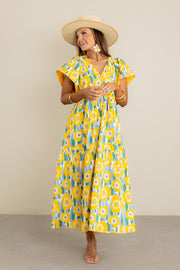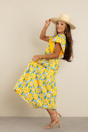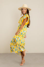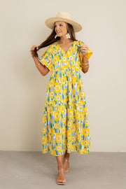 Showcasing a delicate v-neckline and charming short sleeves, this dress is adorned with a vibrant floral print. The midi length provides a touch of sophistication, while the side pockets add convenience.