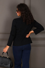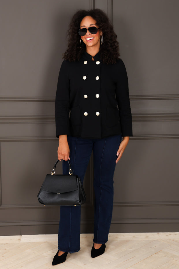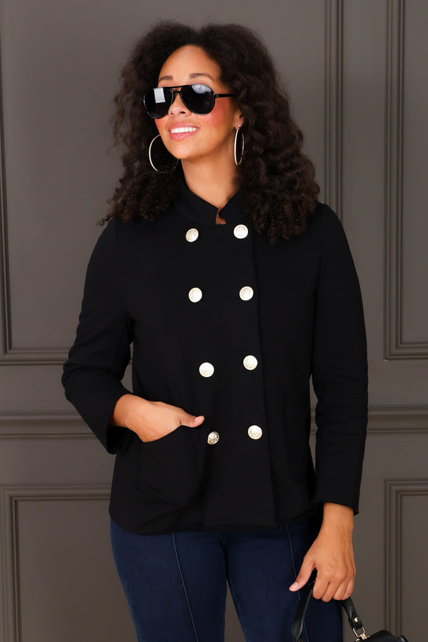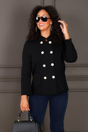 This black military-style jacket features a top collar, button-down front, and long sleeves for a classic look. Its waist-length design with side pockets offers both style and convenience, making it a versatile addition to your wardrobe.