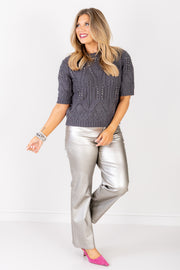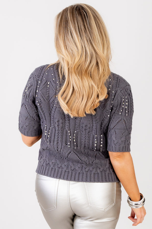 This Sweater offers a waist-length fit with a rounded neckline and short sleeves. Made from soft knitted fabric, it features elegant rhinestone accents for a subtle, stylish shine.