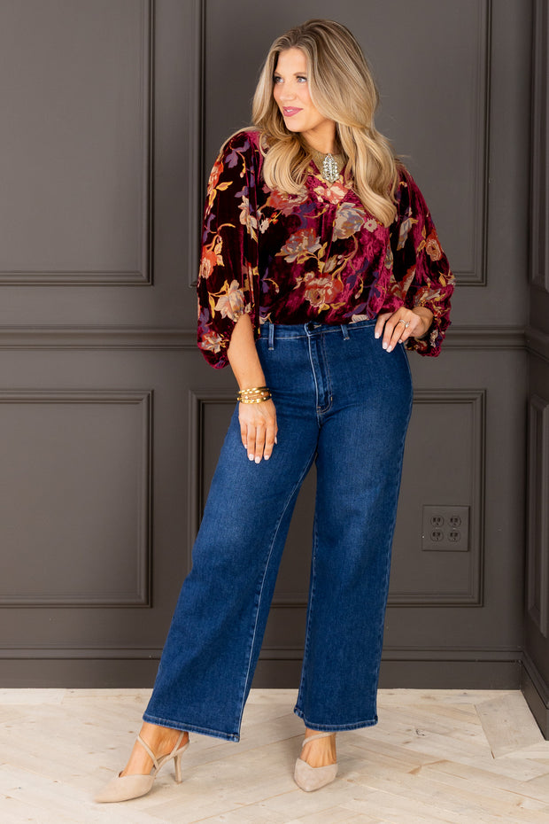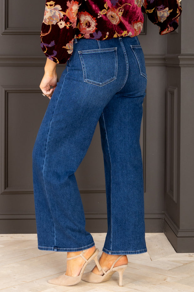 These jeans feature a high waistband and wide leg silhouette, offering a flattering fit and roomy comfort. The hidden pocket adds a sleek, functional detail to your look.