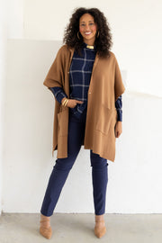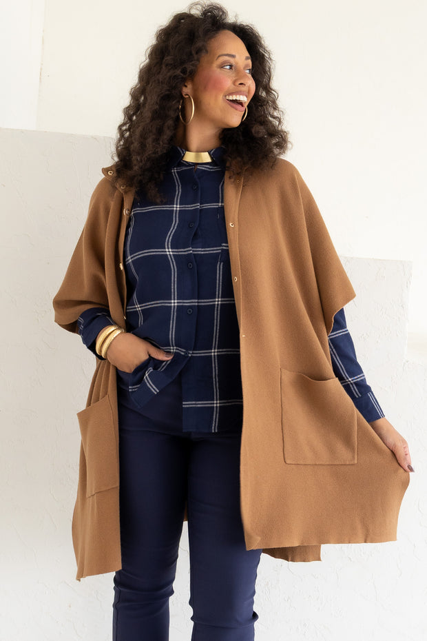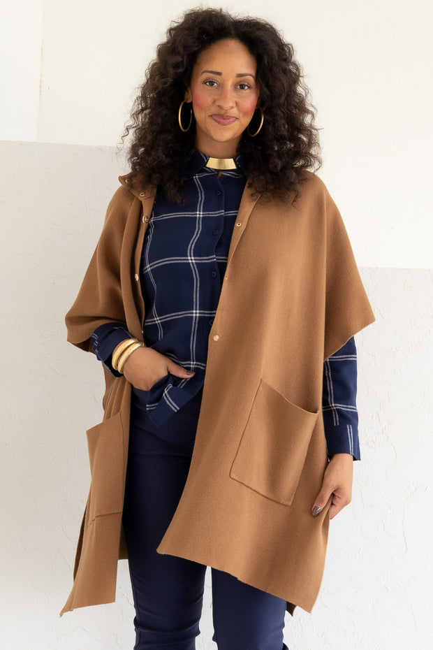This camel cape features a top collar, short sleeves, button-down front, and a longer length for stylish coverage and easy layering in any season.