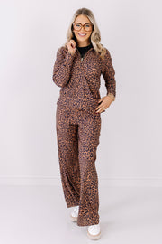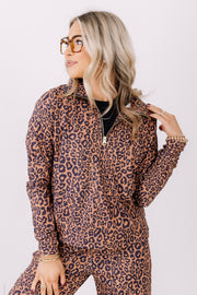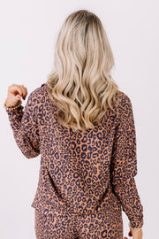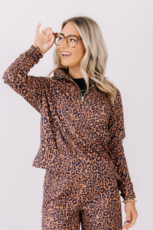 Stylish leopard print pullover featuring a half-zip V-neckline, long sleeves, and waist-length cut. Perfect for layering or wearing solo.