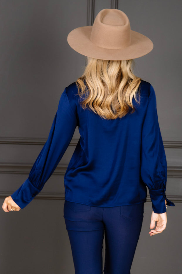 Elevate your everyday style with this navy long sleeve blouse featuring a sleek mock neck and silky satin-like fabric. The button closure at the back of the neck adds modern sophistication, while cuffed sleeves and breathable material ensure all-day comfort and effortless elegance.
