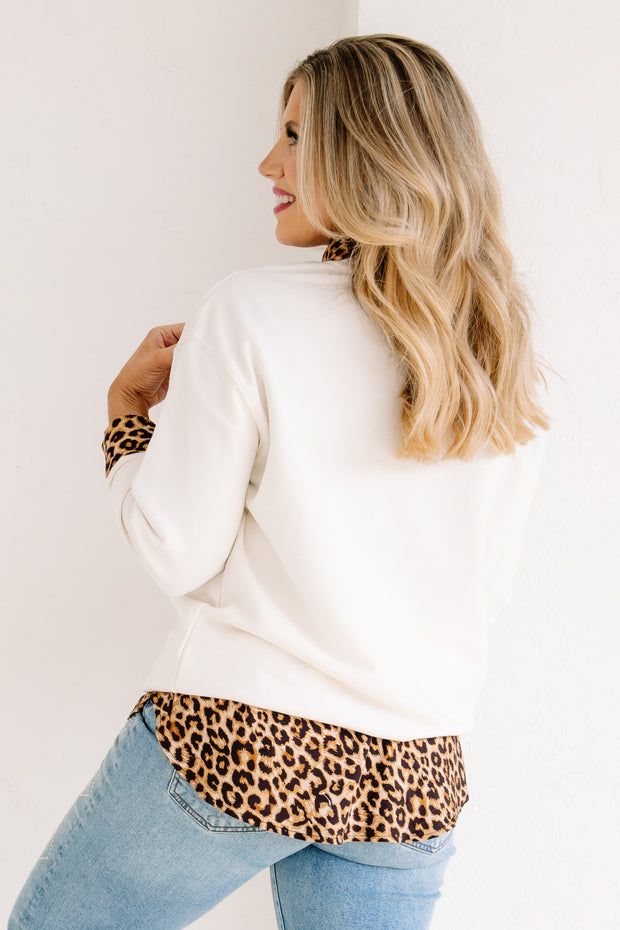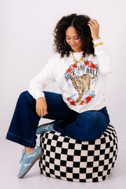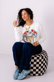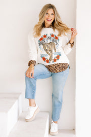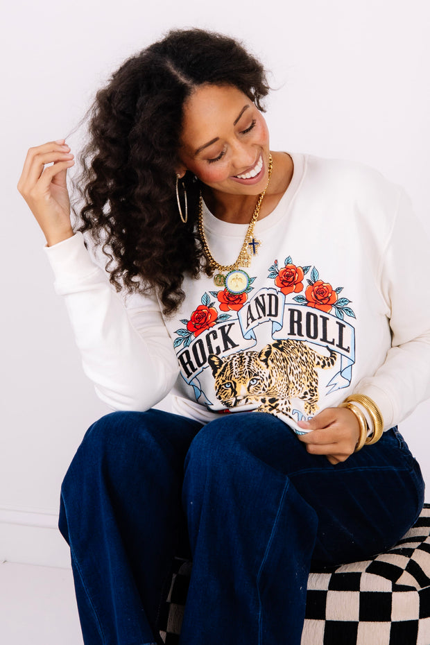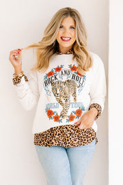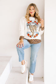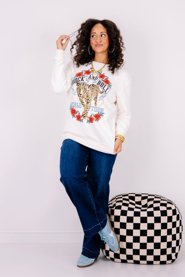 Rock & Roll World Tour Ivory Leopard Sweatshirt features a bold graphic, rounded neckline, and long sleeves. Waist-length cut offers a flattering silhouette perfect for casual style.
