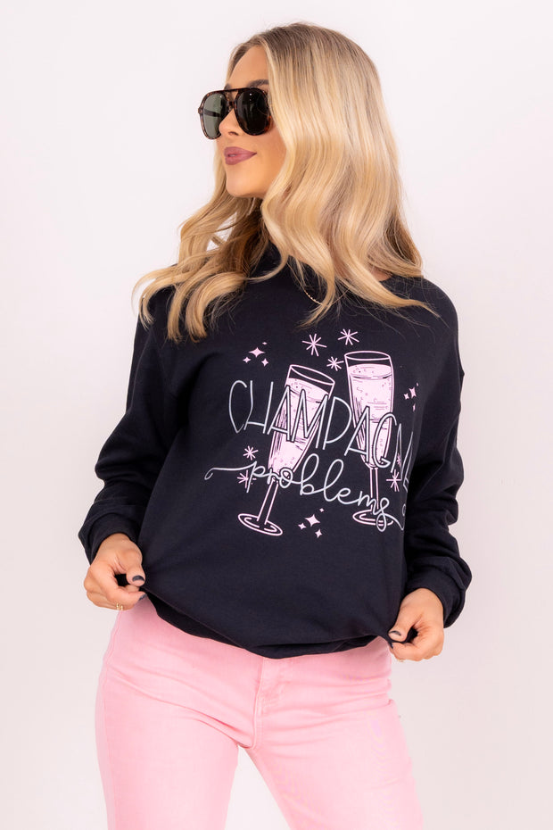 Cozy black sweatshirt featuring a rounded neckline and long sleeves. Waist-length cut with eye-catching Champagne Problems graphic on the front.