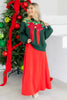 This dark green, waist-length sweater features a cozy rounded neckline, long sleeves, and elegant wreath detailing, crafted from soft sweater material for warmth and style during cooler days.