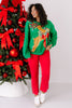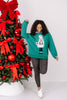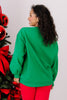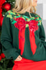 Cozy green long sleeve sweatshirt with a round neckline, decorated with shimmering rhinestones and a metallic bow for a festive, sparkling look that’s perfect for holiday fun and comfort.