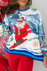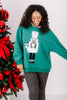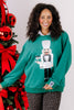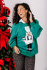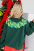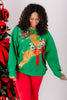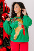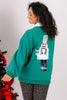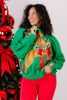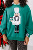 This dark green long-sleeve sweatshirt features a round neckline and a metallic, sequin nutcracker server holding a dish of beaded caviar, adding festive sparkle and charm to your cozy look.