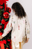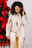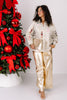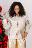 Gold and white striped long sleeve button-up top with collar, featuring sequin nutcrackers holding cocktails. This festive, eye-catching piece adds playful sparkle to your holiday wardrobe.