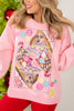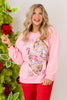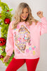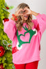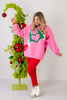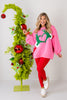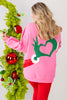 The QOS X TWT Grinch Hand Long Sleeve Pink Sweatshirt features a soft pink color with a round neckline and long sleeves. Its playful design showcases green Grinch hands forming a heart, combining comfort with a fun, festive touch.
