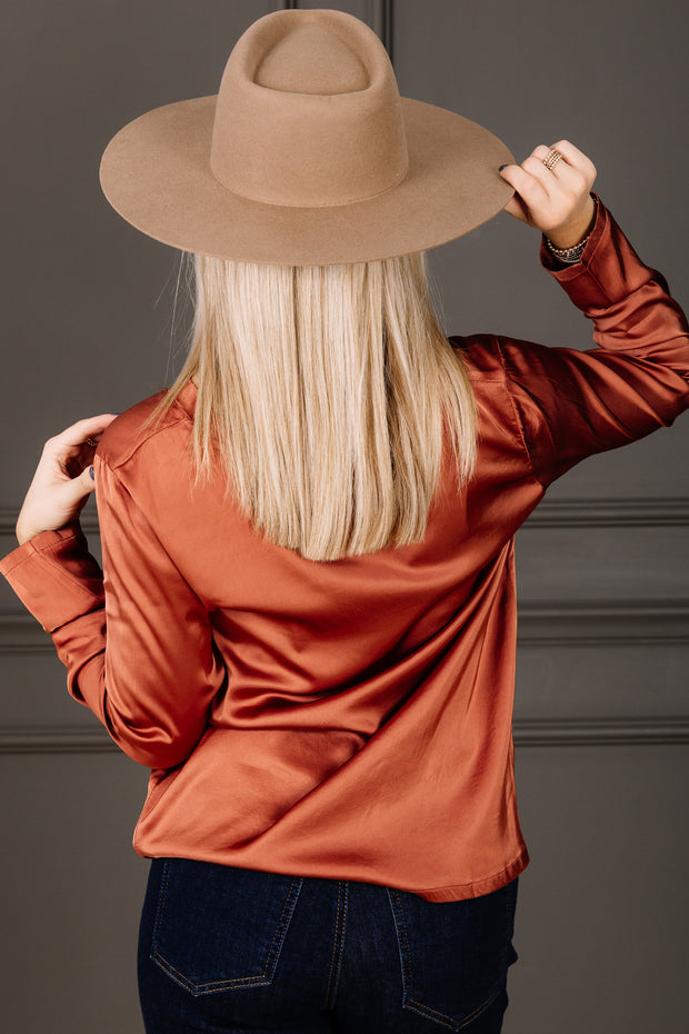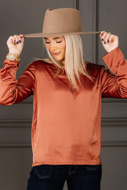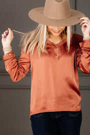 This brown blouse features a satin-like finish with a flattering V-neckline and long sleeves. Made from breathable, comfortable material, it offers a stylish and easy-to-wear option for any occasion.