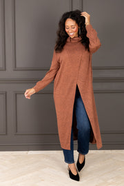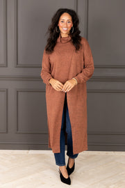 This latte taupe long sleeve tunic features a mock neckline and opens in the front, offering a relaxed and versatile style. Its soft fabric and side makes it comfortable for everyday wear.