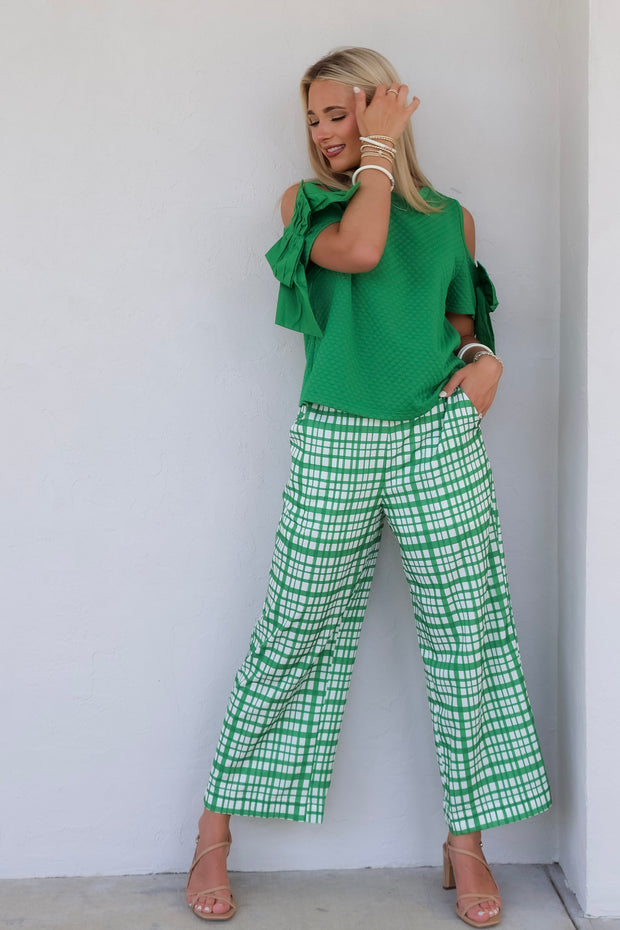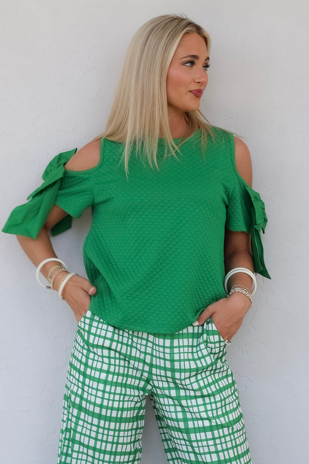 This green short sleeve top features a round neckline and stylish shoulder cutouts with bow details. Made from comfortable material, it offers a relaxed fit perfect for everyday wear.