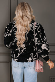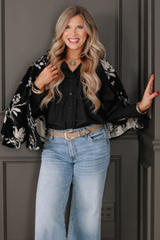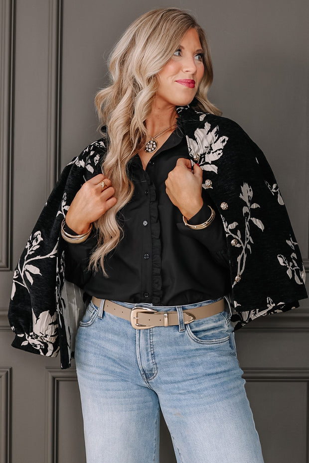 This black long sleeve jacket features a suede-like fabric and a V neckline. It buttons down the front with gold detailed buttons, combining classic style with a soft, comfortable feel.