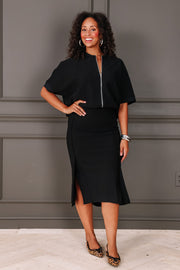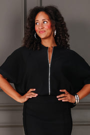 The Katy Black Full Zip Short Sleeve Top can be worn as a top or light jacket. It features a full zip front and a round neckline, offering versatile style and easy layering for any season.