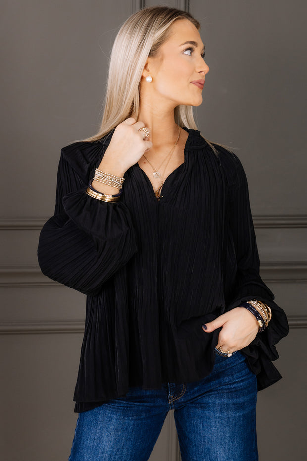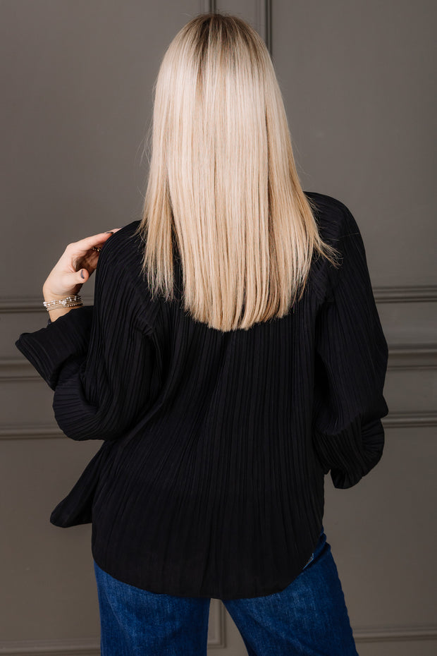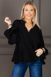 This black pleated blouse features long sleeves, a delicate ruffle detail, and a flattering V-neckline. Made from breathable, comfortable material, it offers both style and ease for all-day wear.
