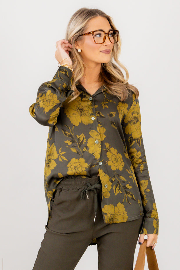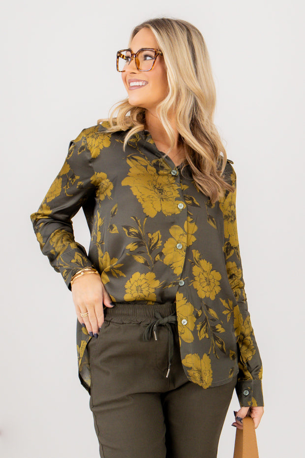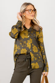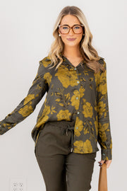 The Least of These Green Floral Print Long Sleeve Blouse features a soft, silk-like fabric with a long sleeve design and a V-neckline. It includes a button-down front and a classic top collar, offering a polished and comfortable look.