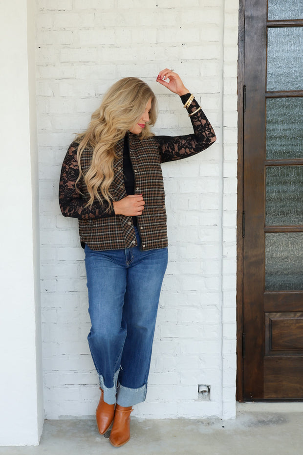This Vest features a sleeveless, waist-length design with a top collar for added warmth. Its zip-down front makes it easy to wear, while the plaid print adds a classic touch. Perfect for layering on cooler days, this vest combines style and comfort effortlessly.