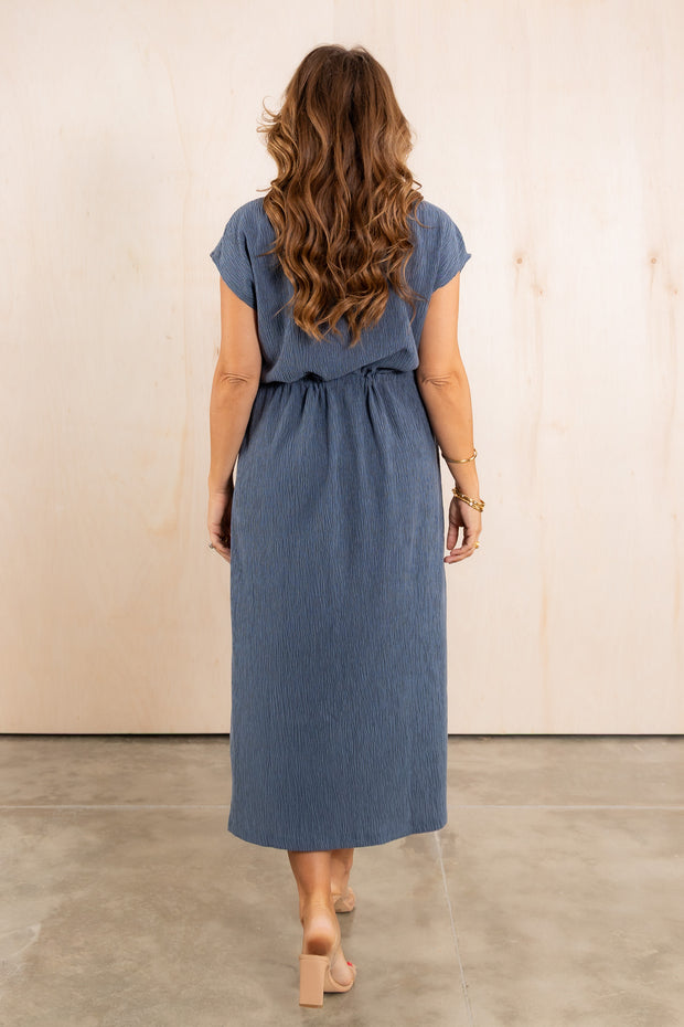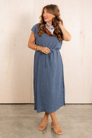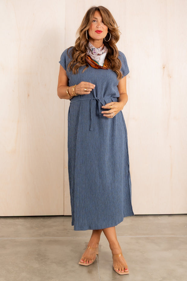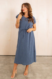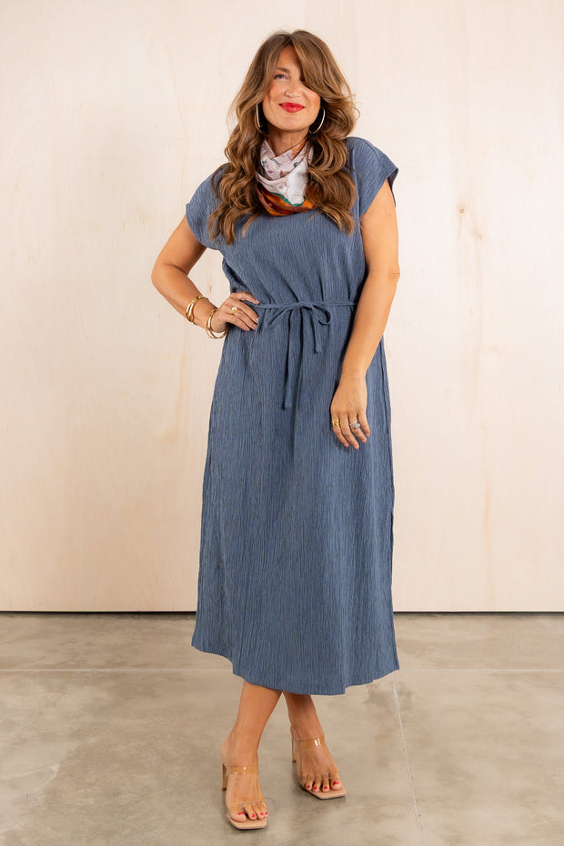 This Midi Dress features a rounded neckline and cap sleeves for a comfortable fit. The midi length and waist tie create a flattering silhouette, while the textured material adds subtle detail.