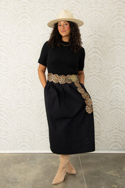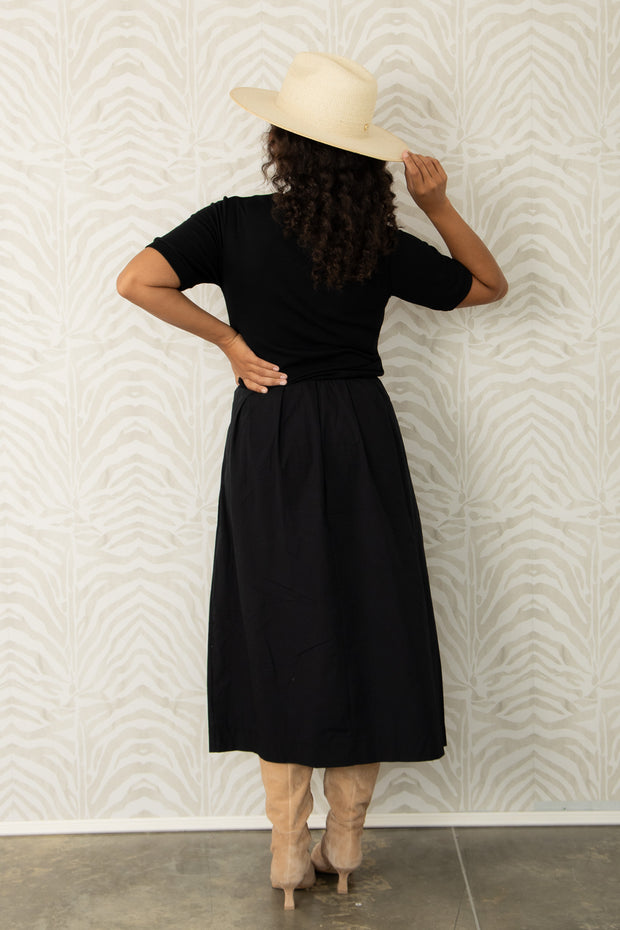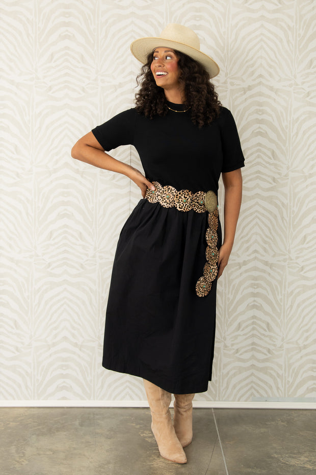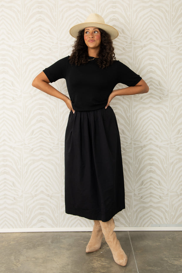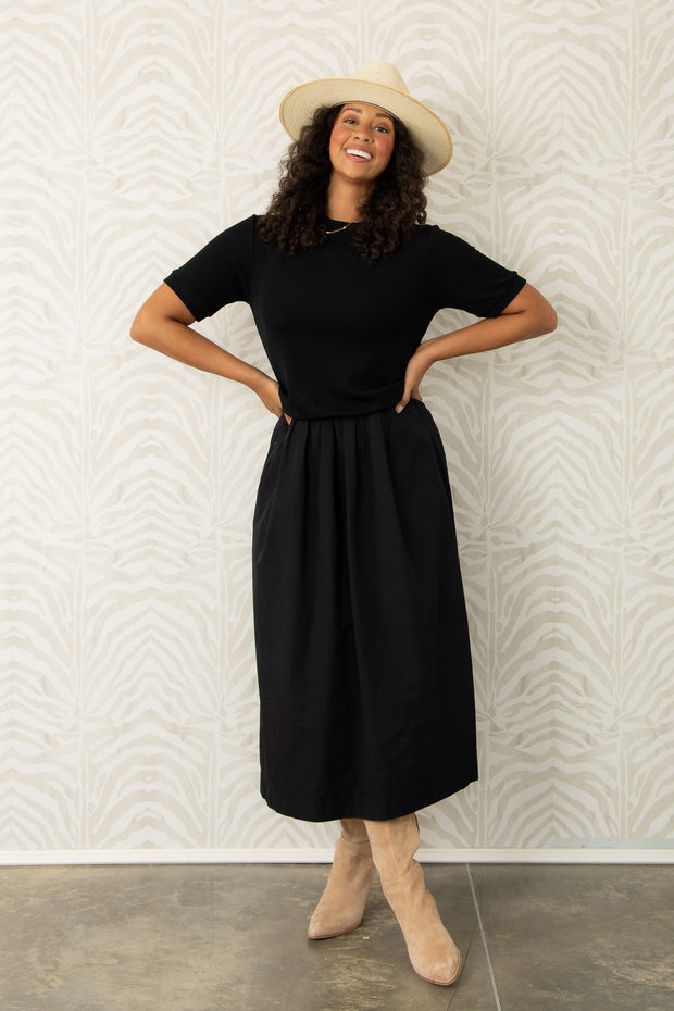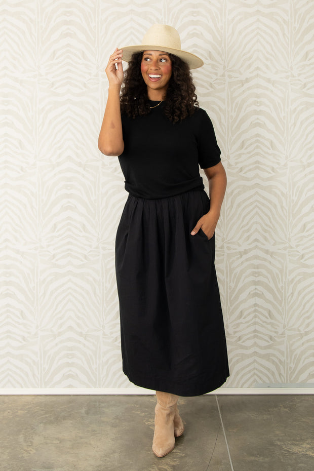 The Feeling Black Short Sleeve Maxi Dress combines a comfortable short sleeve black sweater top with a flowing maxi skirt. It features a round neckline and side pockets, offering both style and practicality. Made from breathable fabric, this dress keeps you comfortable all day.