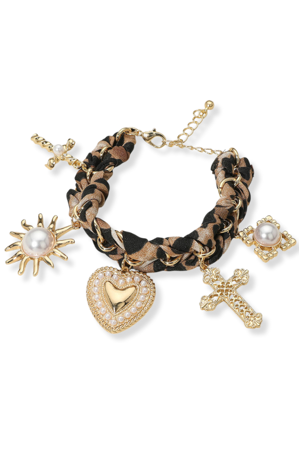 This bracelet features a unique combination of pearl-embellished heart, cross, and sunburst charms along with a leopard fabric chain, creating a stylish and eye-catching accessory.