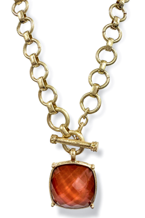 Featuring a vibrant deep brown stone and elegant toggle detail, this gold statement necklace is both eye-catching and sophisticated. Elevate any outfit with this exquisite piece.