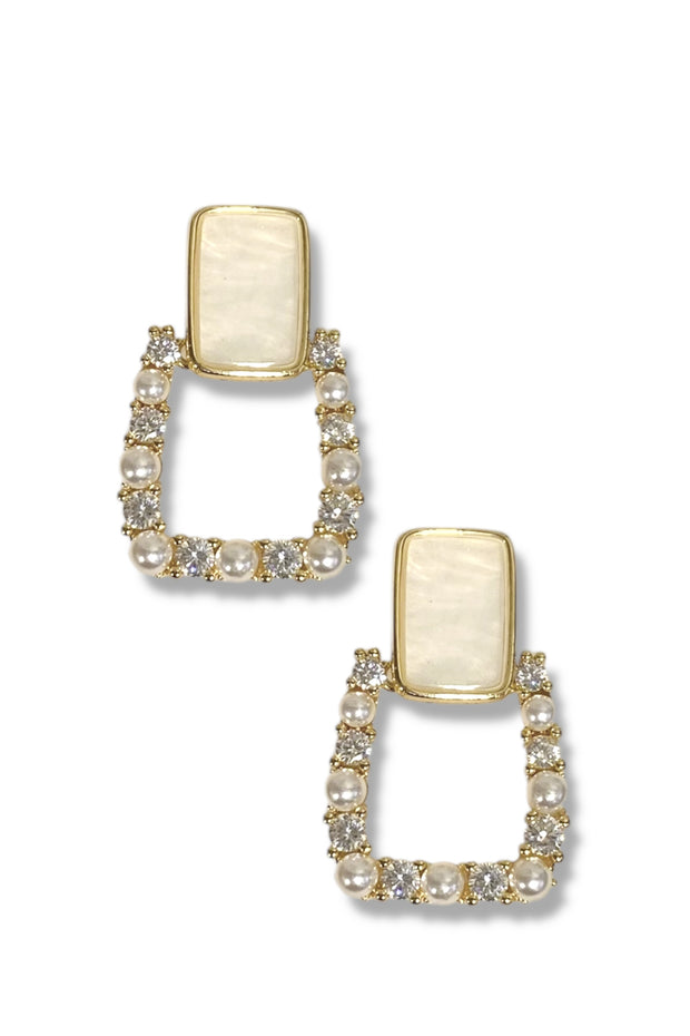 Add a touch of elegance with these Earrings. Featuring gold-dipped geometric shapes adorned with shimmering CZ stones and delicate pearls, these earrings bring a subtle yet striking accent to any outfit.