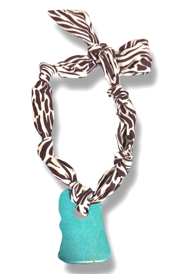 This necklace combines bold chocolate and zebra print patterns with a vibrant turquoise accent. This unique accessory adds a pop of color and style to any outfit while offering the comfort and versatility of a soft scarf.