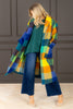 Cozy long sleeve sweater cardigan in navy, cream, and blue abstract print. Perfect for layering, this stylish coatigan adds warmth and a modern touch to any outfit while keeping you comfortable all day.