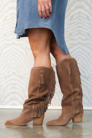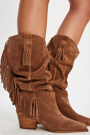 So classic with western-inspired flair, these bold fringe boots feature a soft suede upper with fringe tassel trimming, snipped pointed toe, and block heel for added height.