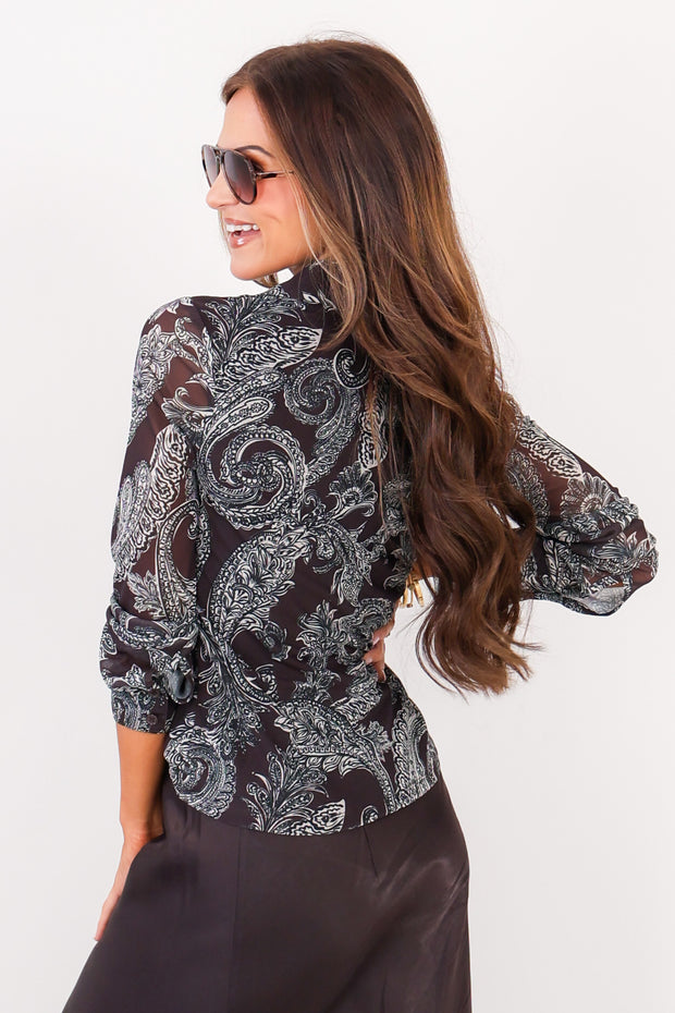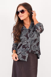 This fitted long sleeve button-down top features a mesh fabric with a mineral paisley pattern. It has a classic collar and offers a comfortable, flattering fit, making it a versatile addition to your wardrobe.