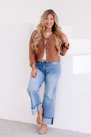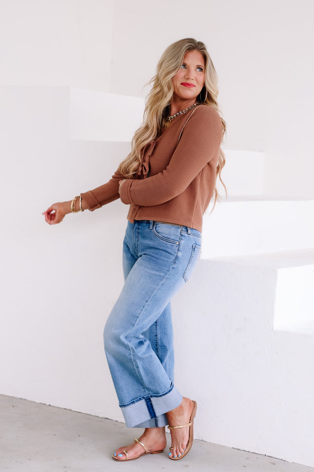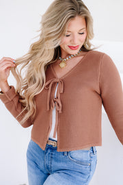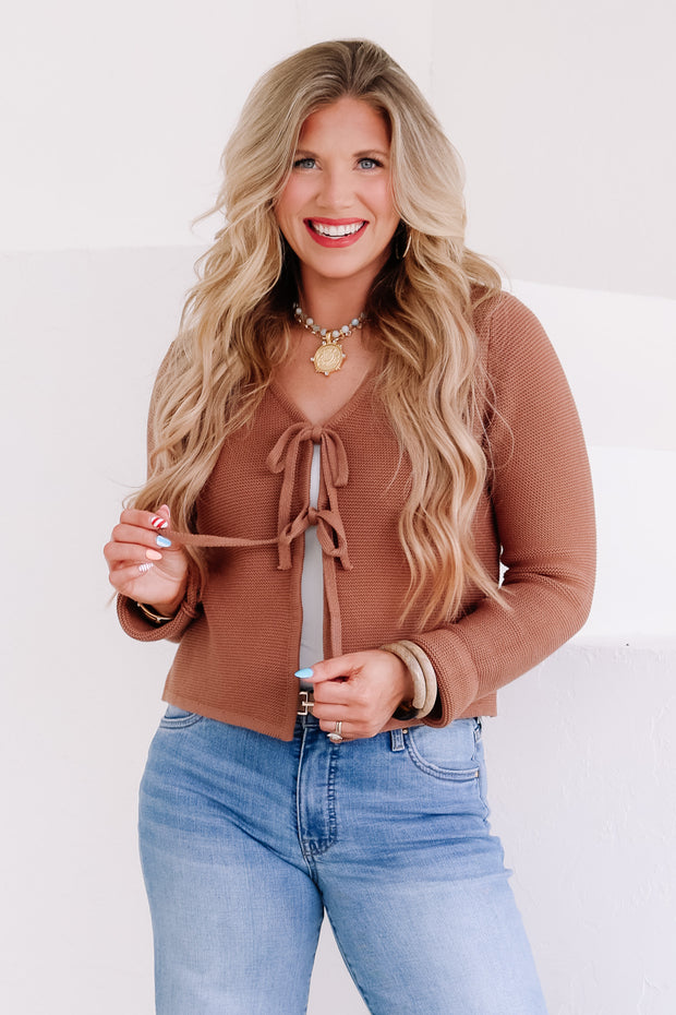 This deep camel long sleeve sweater top features a tie front design and breathable fabric, providing both comfort and a stylish look for any occasion.