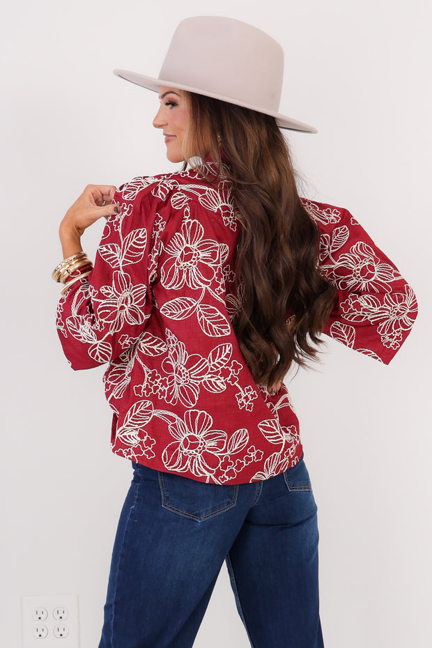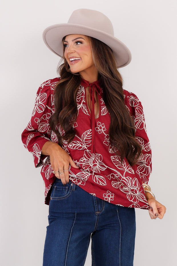 The Want it All Burgundy Bell Sleeve Top features a V-neckline with a white tie collar and white floral embroidered detailing. Its bell sleeves add a stylish touch, making it a comfortable and pretty choice for any occasion.