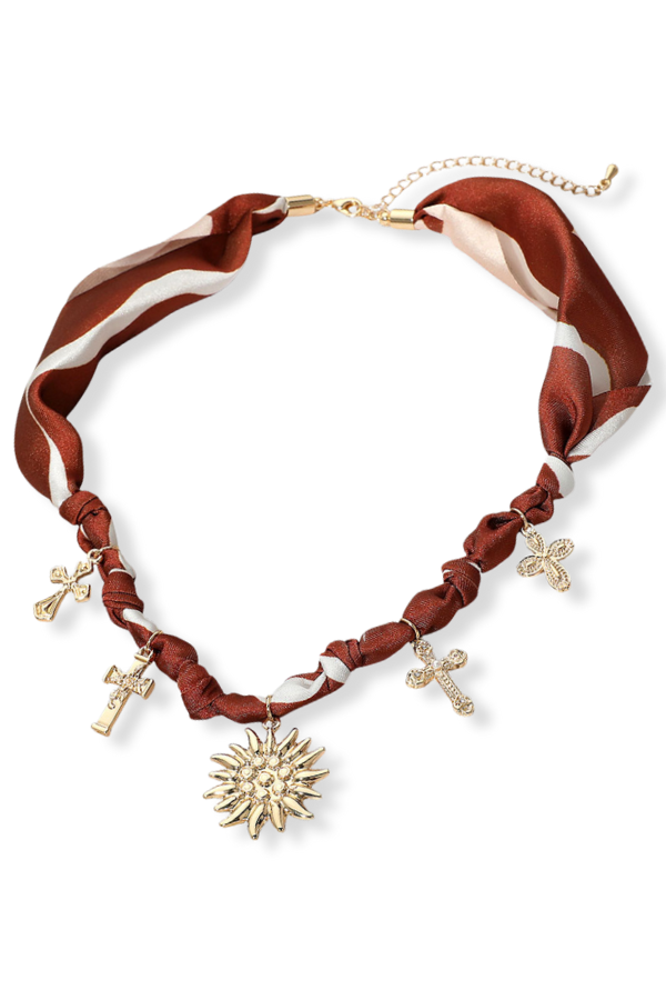 This necklace combines the elegance of a soft scarf with the charm of a sunburst and cross charms. Perfect for layering or wearing alone, it’s an easy way to enhance your daily look.