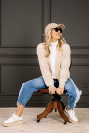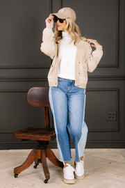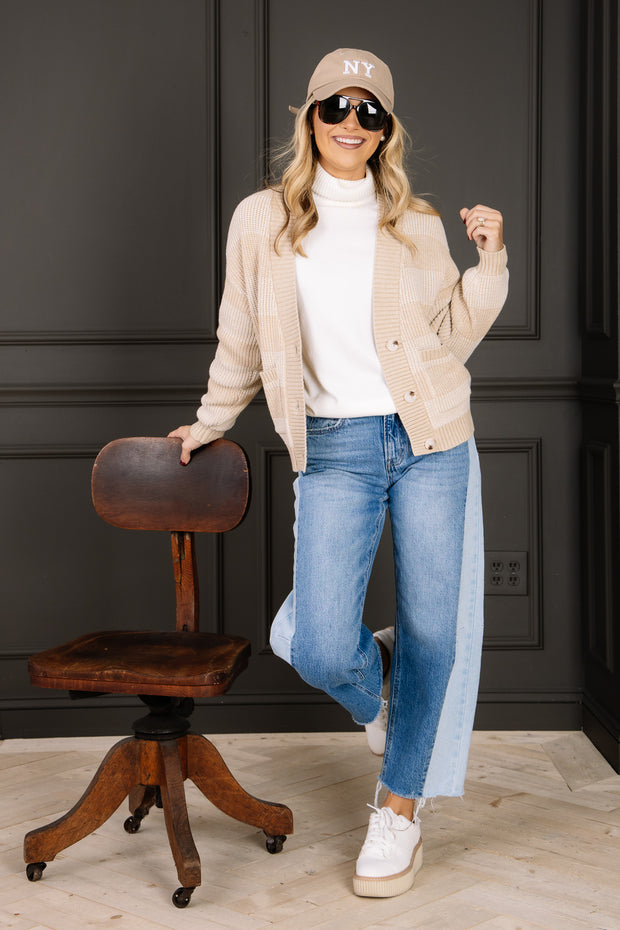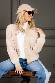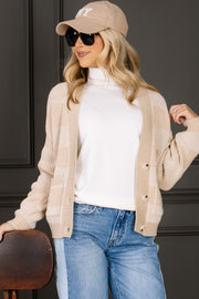 Cozy knitted cardigan featuring a button front closure and long sleeves. Perfect waist-length cut for versatile layering. Crafted from soft knit material in a warm heather latte tone.