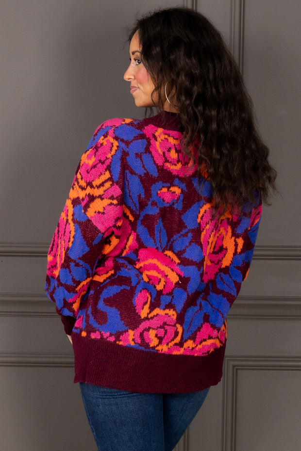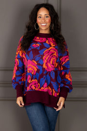 Elegant maroon sweater featuring a charming floral print. Rounded neckline and long sleeves provide classic comfort, while the waist-length cut flatters any silhouette.