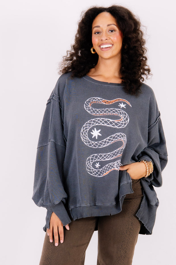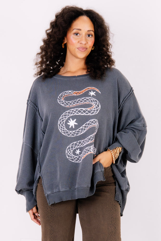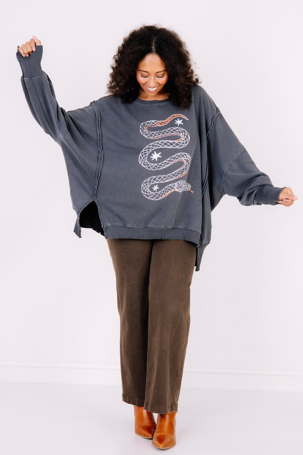 This Sweatshirt features a rounded neckline and long sleeves for a comfortable fit. Its waist-length design and oversized fit provide a relaxed, cozy style. The front showcases a detailed Snake graphic, adding a charming touch to your casual wardrobe.