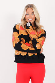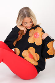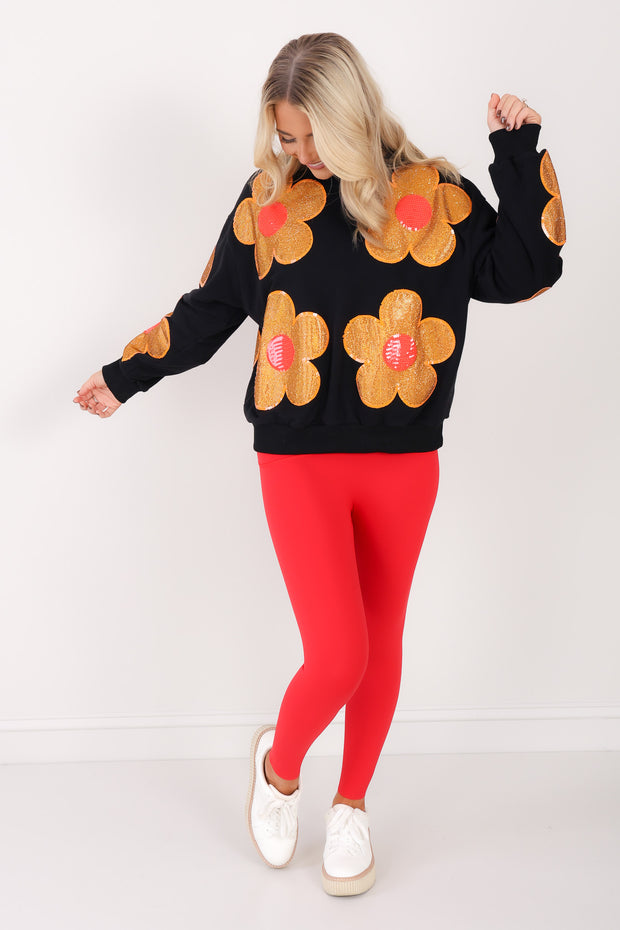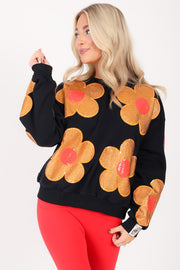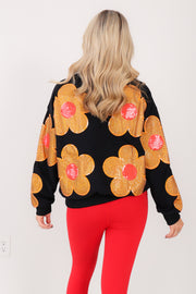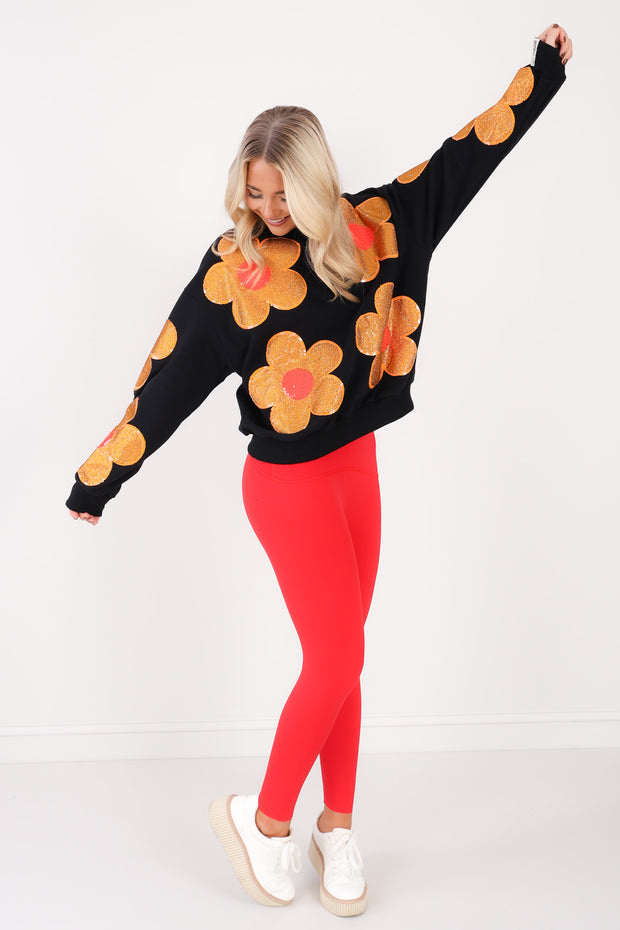 This black sweatshirt features a comfortable rounded neckline and long sleeves, designed to hit at the waist for a flattering fit. Made from soft fleece material, it offers warmth and coziness. A sparkling rhinestone flower embellishment adds a touch of shine to this casual, stylish piece.