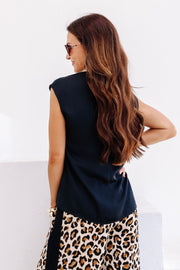 This sleeveless top features a black, silk-like fabric with a round neckline gathered for added detail. Its breathable and comfortable material makes it an elegant and easy-to-wear choice for any occasion.