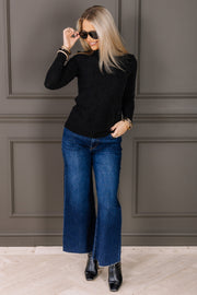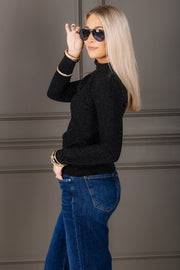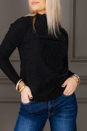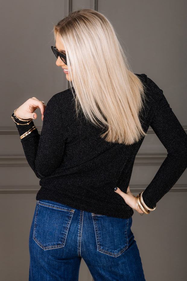 This black long-sleeve mock neck top features subtle glitter for a touch of sparkle. Its comfortable fit and lettuce hemline make it an ideal layering piece for everyday wear, adding style and warmth effortlessly.