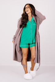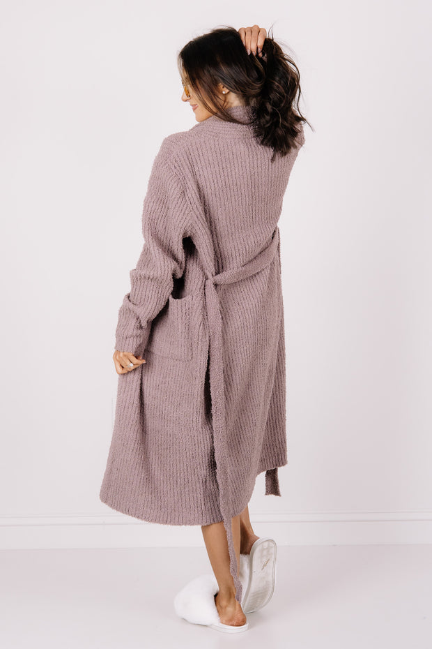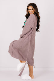 Wrap yourself in effortless elegance with this ribbed mocha robe. Featuring long sleeves, an extended length, and an open front design with a convenient tie closure, it's perfect for layering or lounging in timeless style.